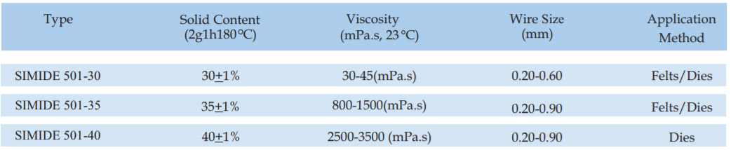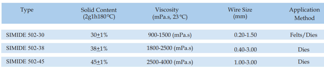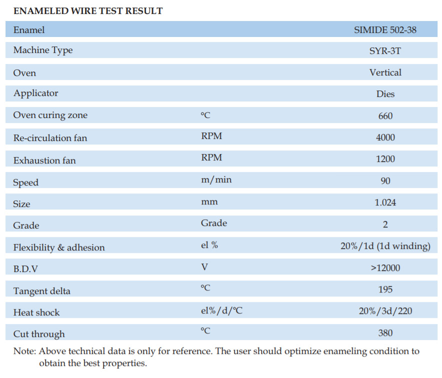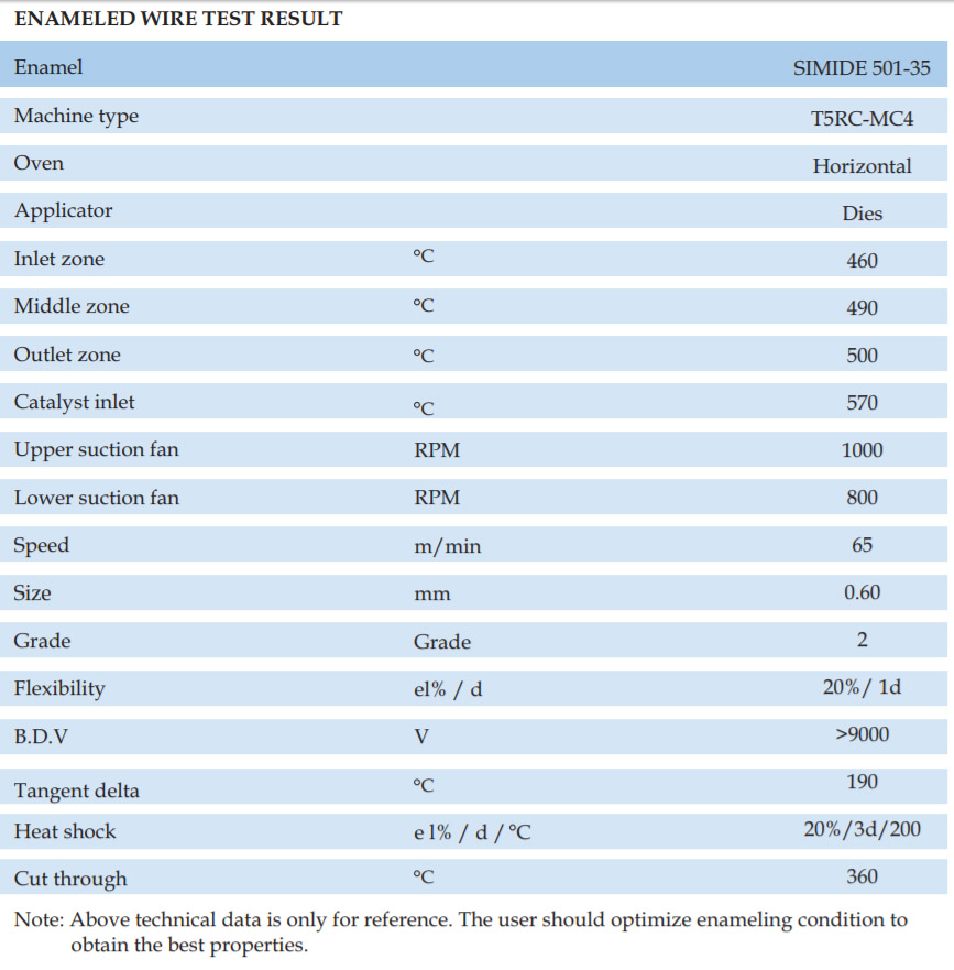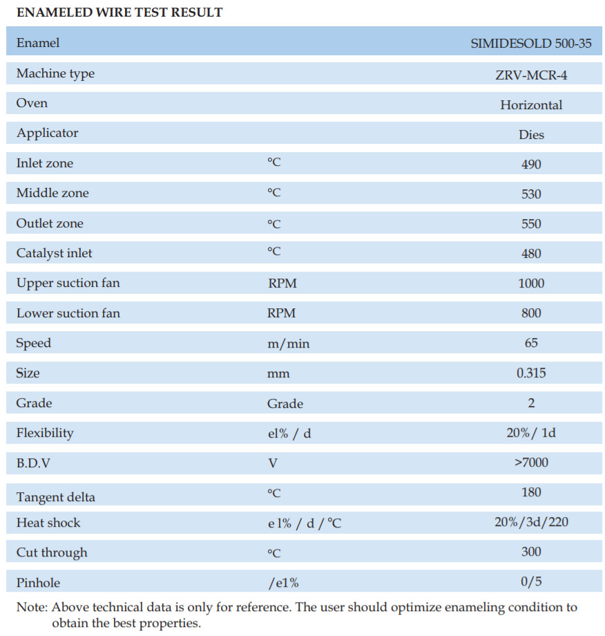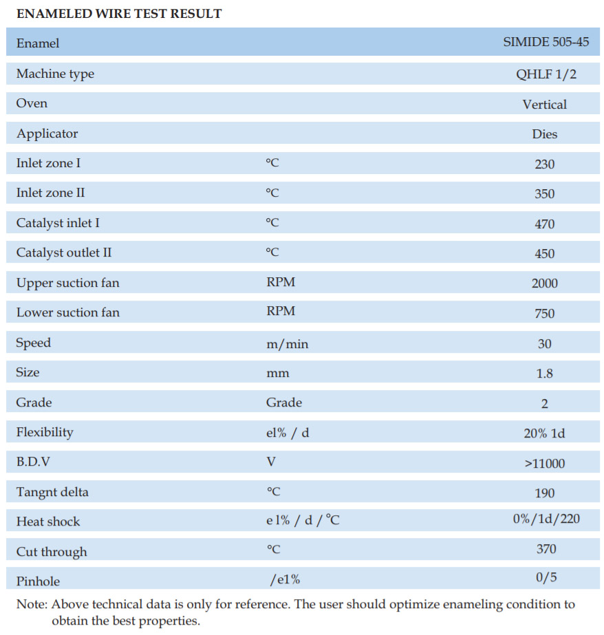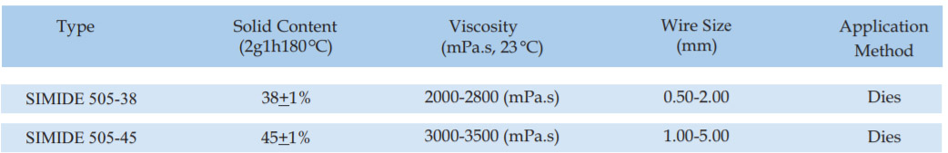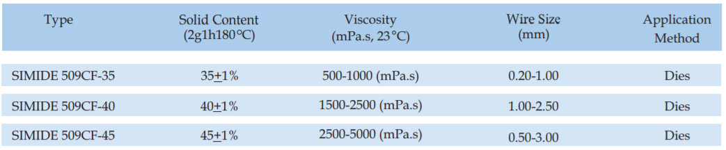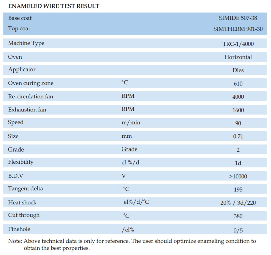 SIMIDE-509CF is a THEIC modifide cresol free polyesterimide wire enamel for pollution free atmosphere. The enamel has a wide backing range and is suitable for single or dual coat, if top coated with fully amide its thermal class upgrades to 200 C.